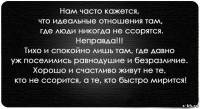Интервью у женщины, прожившей со своим мужем 50 лет без единой ссоры:   — Мадам, но как Вам удалось прожить все это время в мире и гармонии?   — О, все просто. Когда мы обвенчались, мой муж посадил меня на повозку и повез на свое ранчо. Пока мы ехали, одна из лошадей споткнулась, и он спокойно сказал: "Раз".   Спустя 15 минут, все в той же поездке эта же лошадь споткнулась еще раз, и он сказал: "Два".   И уже когда его ранчо было в прямой видимости, эта же лошадь споткнулась в третий раз.   Он сказал: "Три" — и пристрелил ее.   Я, конечно, начала кричать, закатила истерику, начала жалеть бедное   животное…   — И что же?   — И он сказал "Раз"