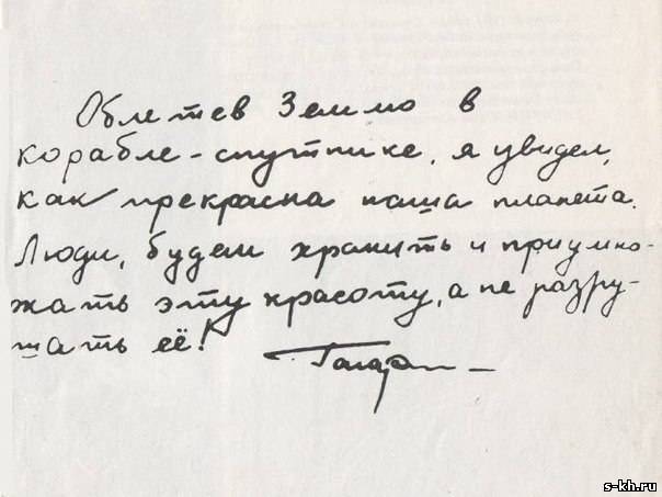 | Записка Юрия Гагарина, написаная после его полета в космос: