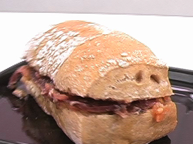 Прекрасный бутерброд для начала трудового дня.Состав:копченая телятина — 200 гр;заварной хлеб — 4 штуки;лимонный сок — 50 гр;чеснок — 3 зубчика;помидора — 3 штуки;оливковое масло, соль, перец — по вкусу.