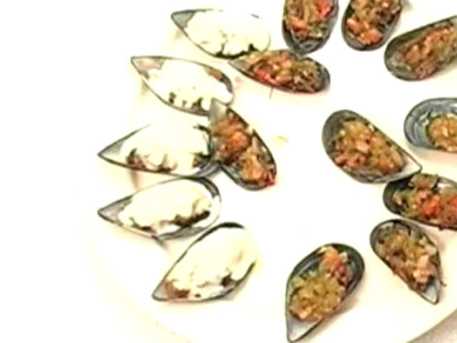 Рецепт приготовления мидий.Состав:мидии — 10 штук;лук — 1 штука;яйцо — 1 штука;перец — 1 штука;чеснок — 4 зубчика;соль, перец, масло, белый соус, коньяк, панировочные сухари, острая паприка.